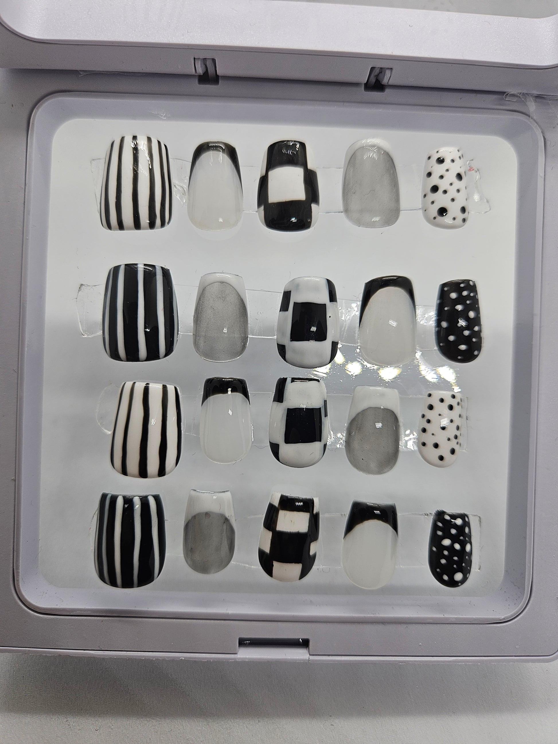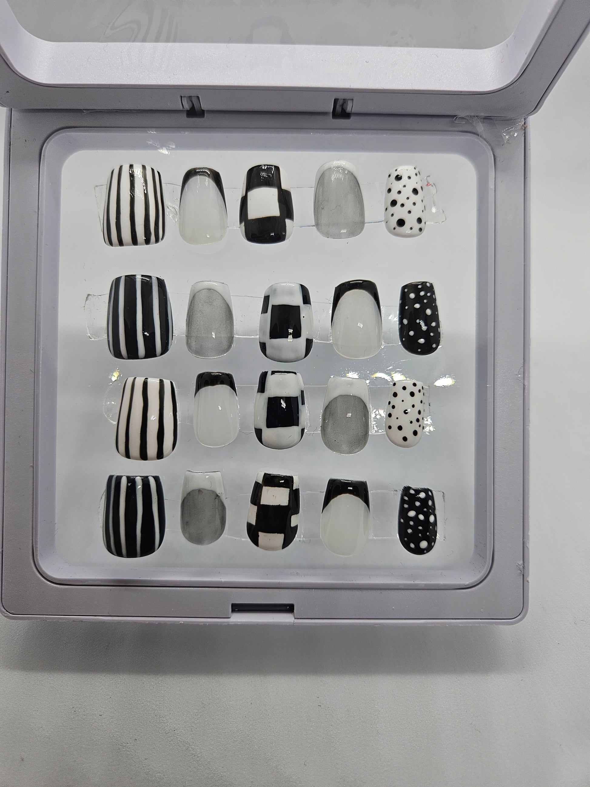 White and black nails with the thumbs being white and black stripes, the pinky white and black dotted design, the pointer and ring fingers are white jelly base with black French tip or black jelly base with white French tip and the middles are checkered black and white.