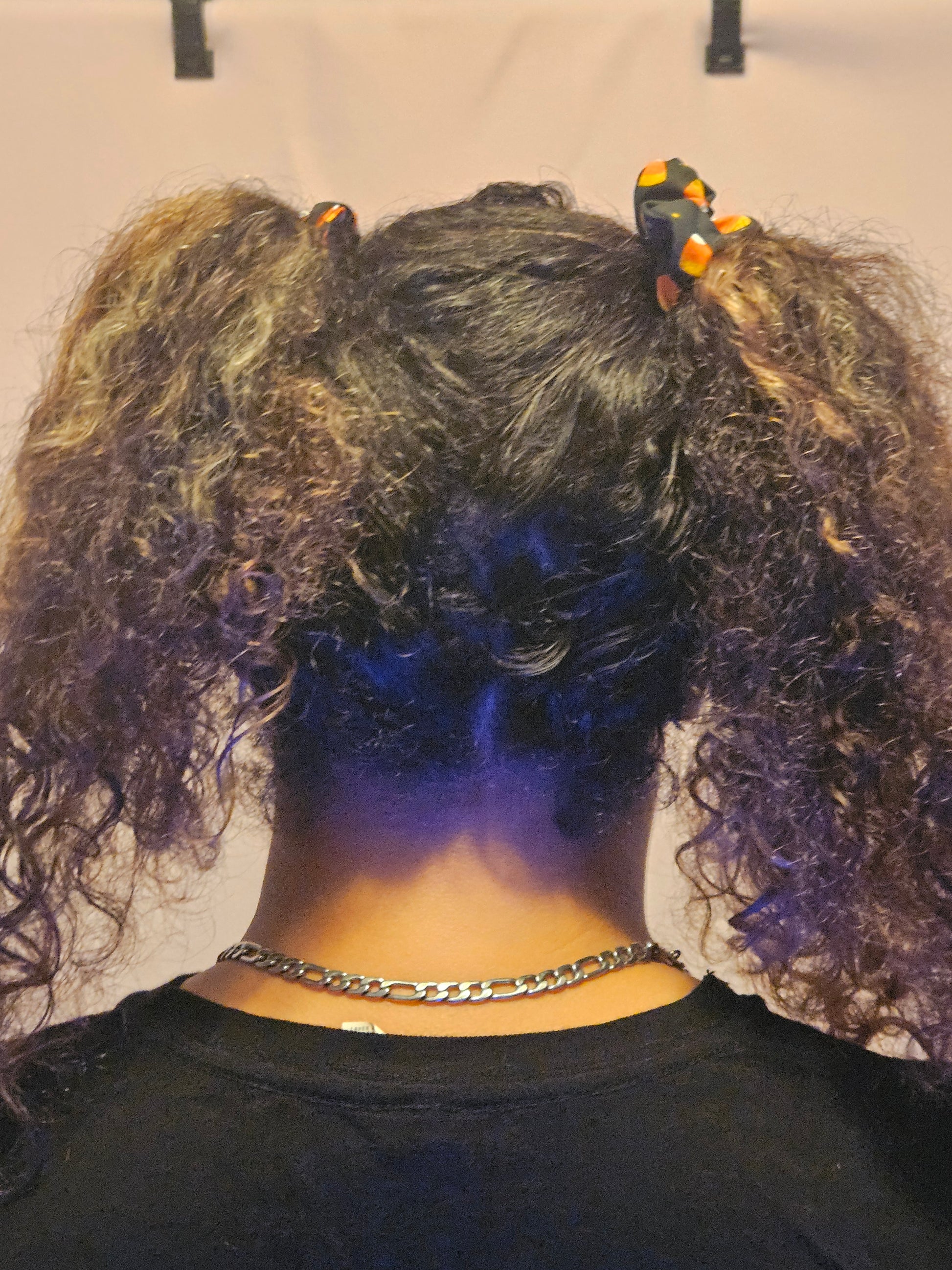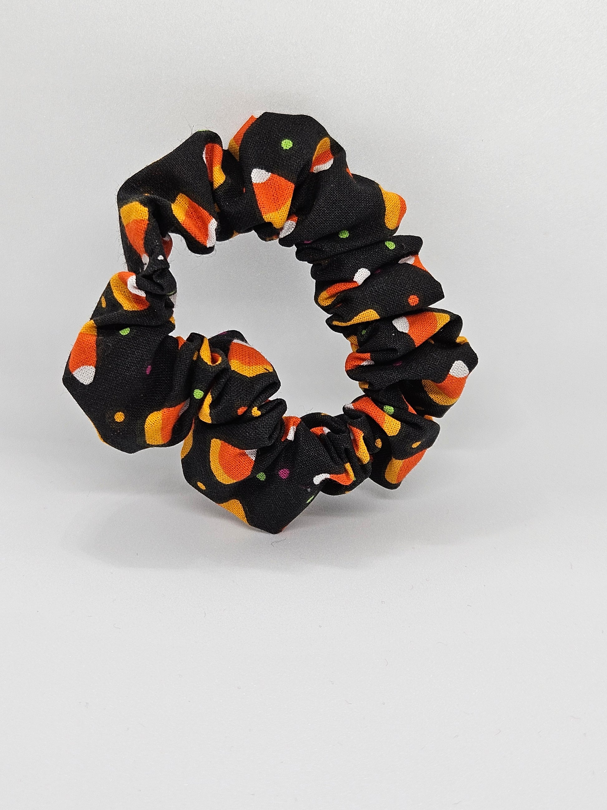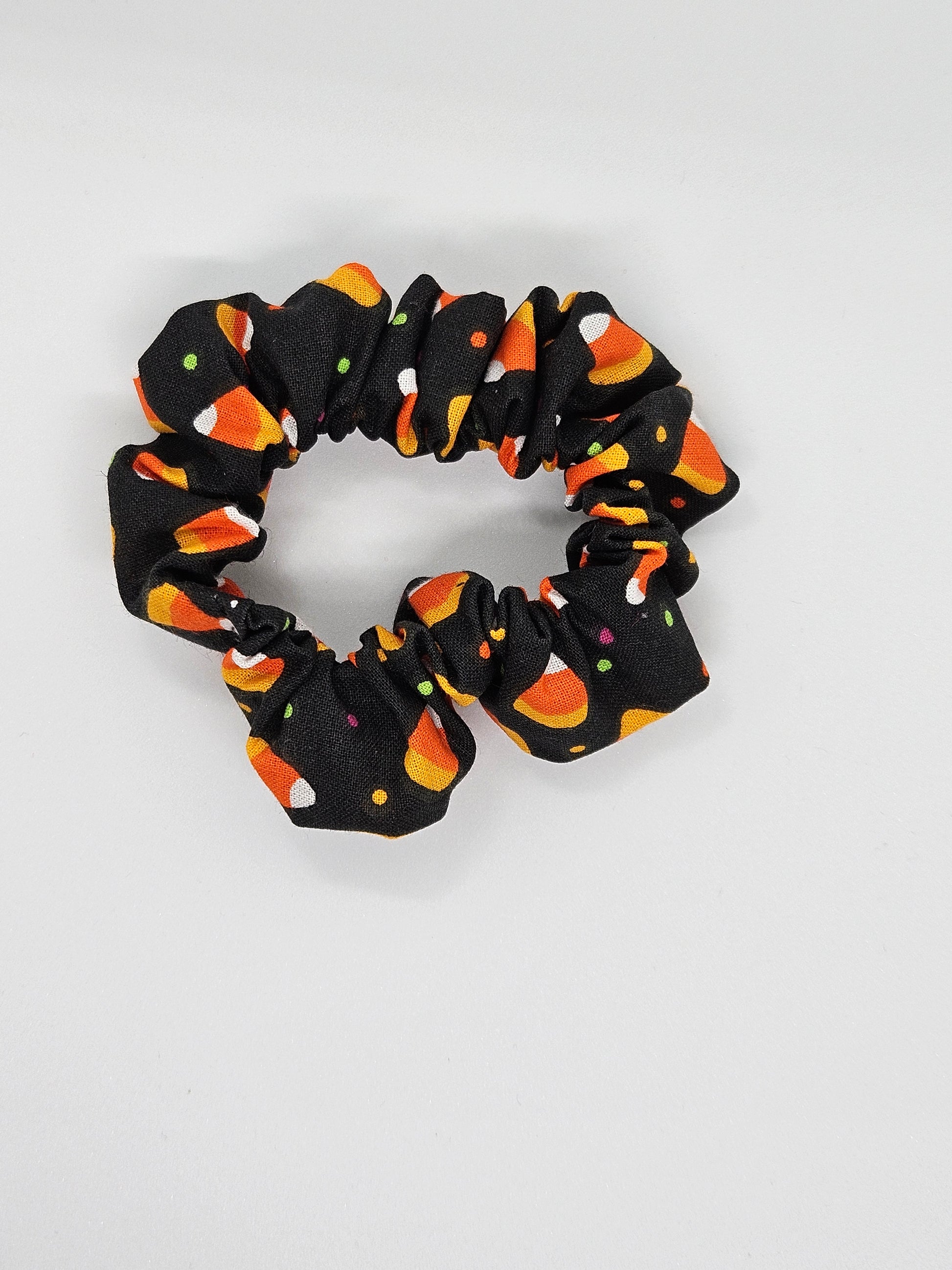 This adorable scrunchy is made of cotton colored with nlack base and designed with candy corns. Only offered in size Princess. 6.5 inches wide. Handmade for all hairtypes and hairstyles.