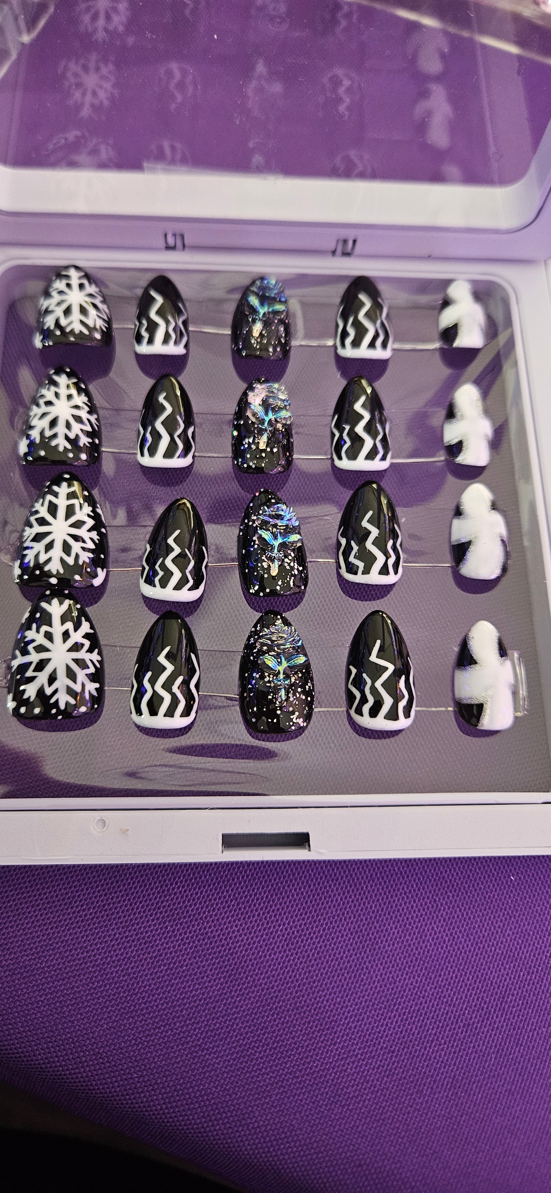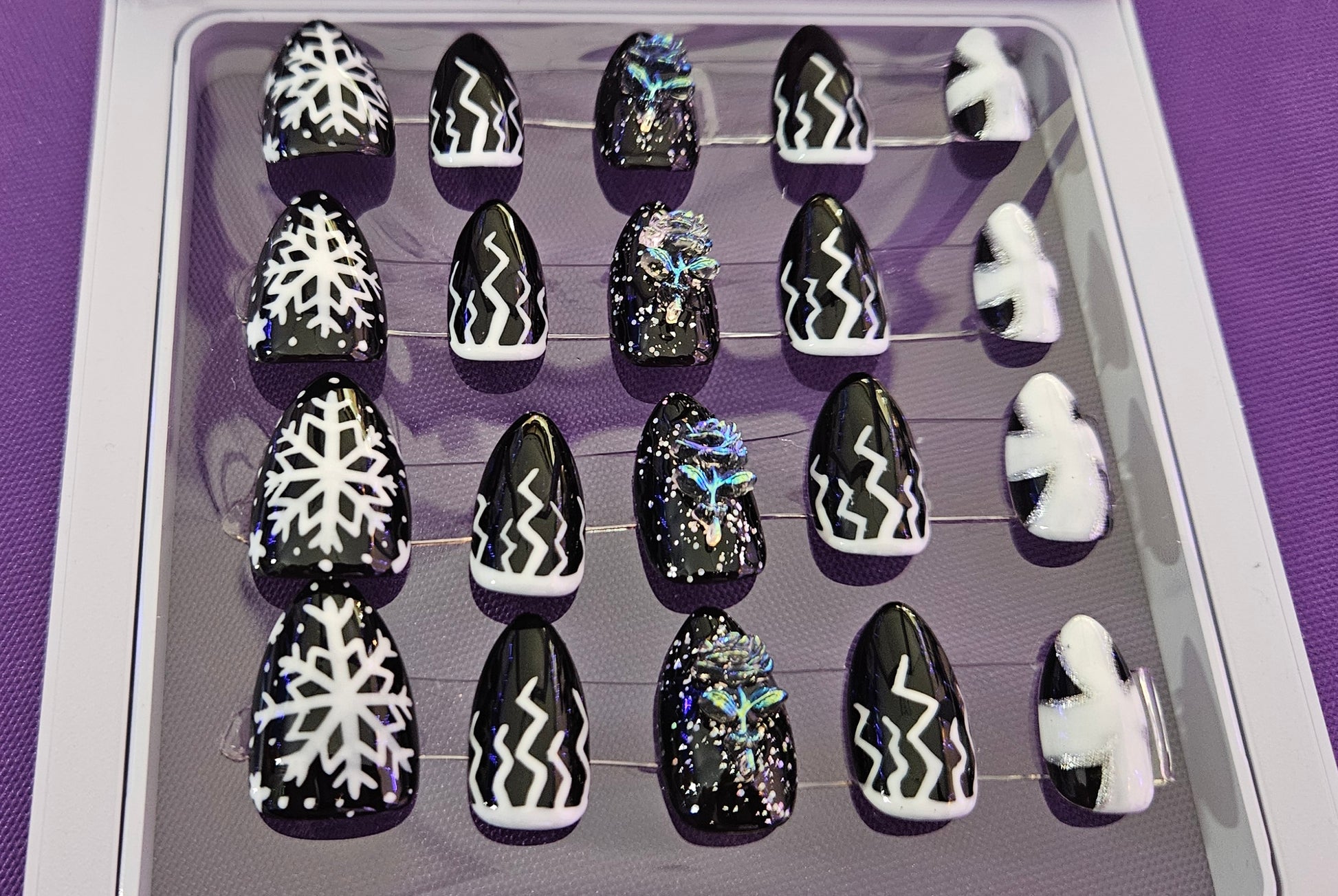 Gothic winter designed nails. Black base with white snow flake on the thumb, white reverse french tip with icicles coming from it for the pointer and ring nails, black base with glitter and iridescent rose on the middle, and black base with white and silver twirl like a peppermint candy.
