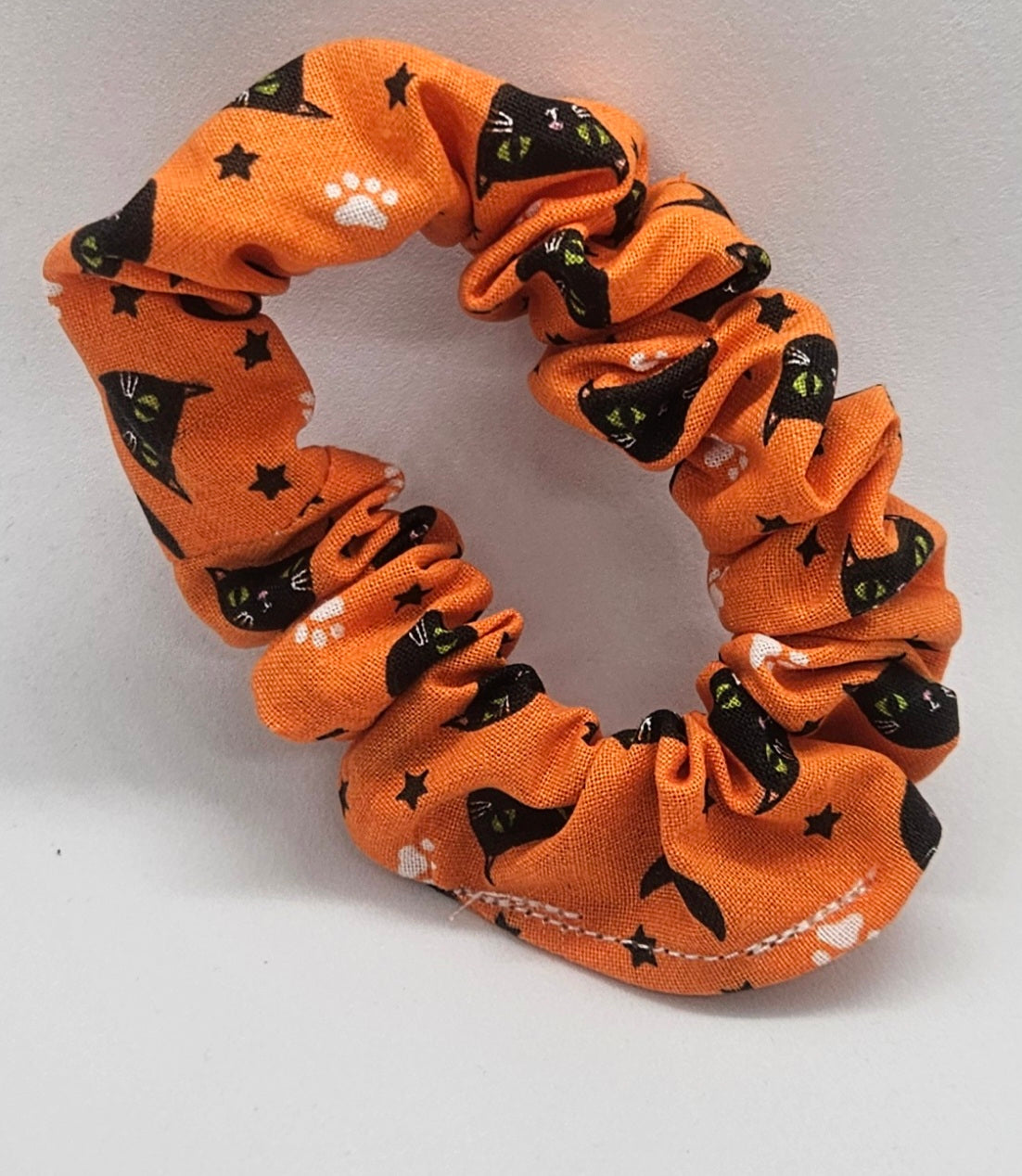 Cute orange cotton scrunchy with black cats and white paws. Offered in 3 sizes and handmade for all hair types and hair styles. Princess approximately 6.5 inches in diameter, Queen approximately 7 inches in diameter, Godess approximately 9 inches in diameter.