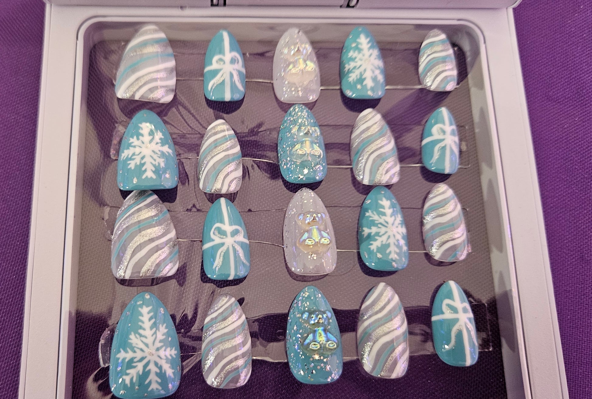 Cute winter set with iridescent 3D teddy bears on middle fingers. Light blue base with white snowflake, light blue base with white and silver bow on the pinky, and white sheer base with silver, white, and light blue curvy stripes on the pointer and ring fingers.